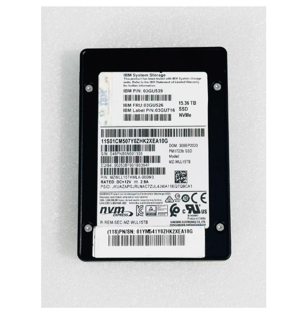 03GU539 is a high-performance, high durability enterprise NVMe solid-state drive designed specifically for FlashSystem 9x00 and 7x00 series full flash storage arrays. This hard drive is typically used in the 03GU526 NVMe expansion cabinet (rack) of storage systems as a core component to enhance storage capacity and performance. It’s hardware foundation is the PM1723B enterprise level disk body, which has undergone strict certification and customized firmware debugging to ensure perfect compatibility and reliability with the storage system.